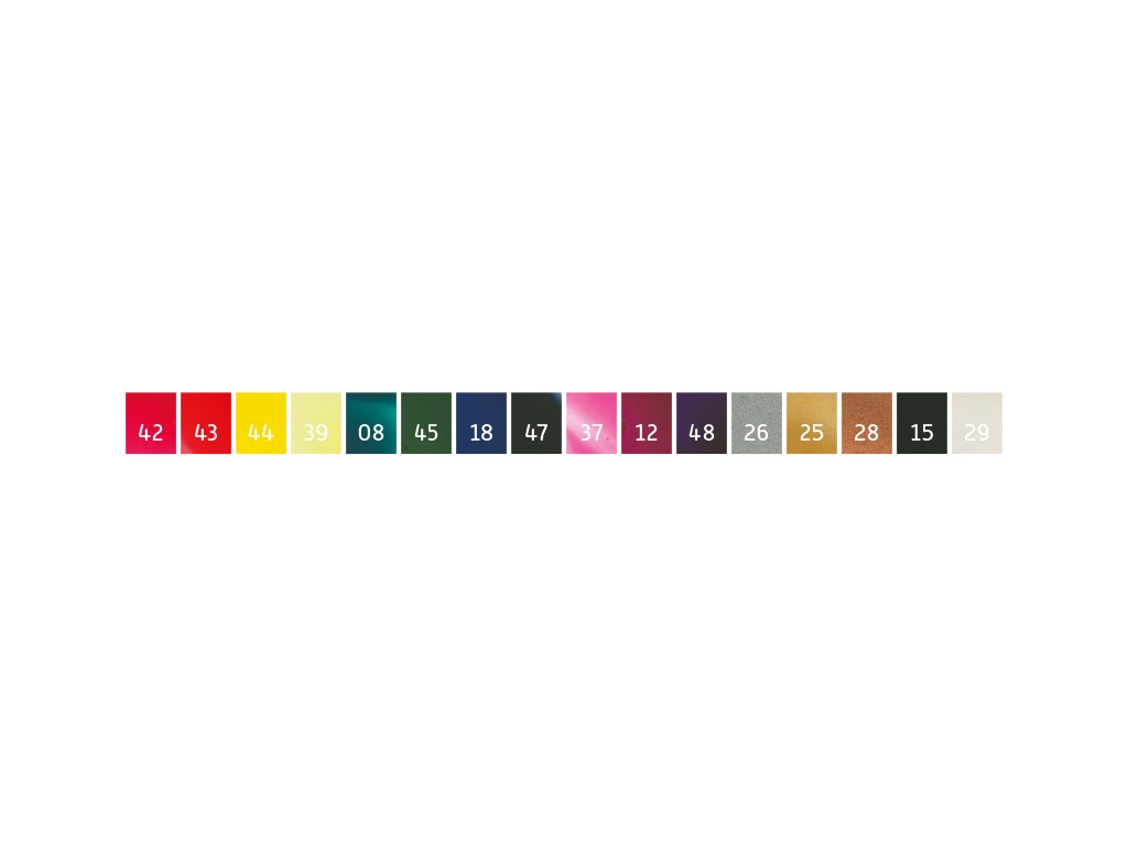 42 míchaná purpurová, 43 míchaná červená, 44 míchaná žlutá, 39 neonová žlutá, 08 modro zelená, 45 míchaná zelená, 18 olivová, 47 míchaná indigová, 37 neonová růžová, 12 červeno fialová, 48 míchaná fialová, 26 metalická stříbrná, 25 metalická zlatá, 28 metalická bronzová, 15 černá, 29 perleťová